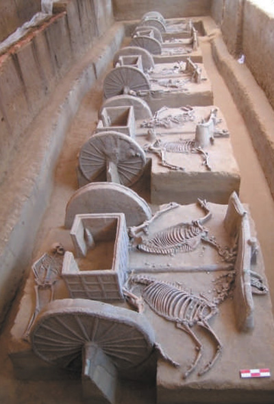 据不完全统计,殷墟至今已出土马车上百辆。较早的如1933年在后冈西区中字型大墓发现车马1辆。2005至2006年,在安钢第二炼钢厂西南发现车马坑10座,其中有5辆车马排列整齐,系殷墟首次发现。在殷墟博物苑,有专门展厅陈列商王朝各式各样的马车,以及当时的车辙和道路基址。
