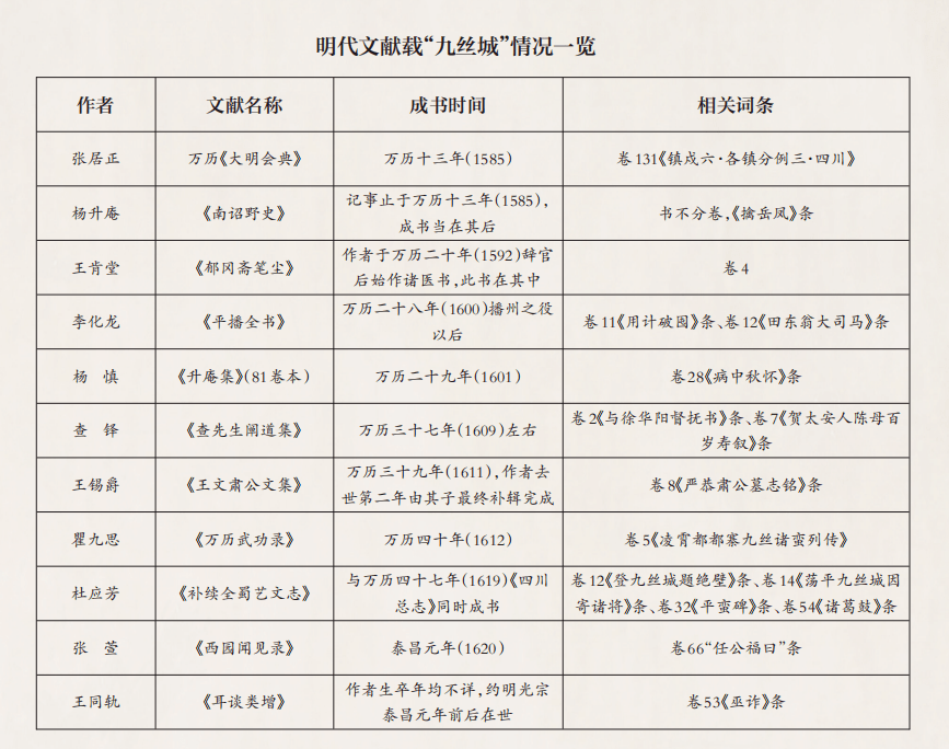 明万历元年(1573),曾省吾在《计处夷情疏》中提到“访众议俱称(都掌)蛮恃九丝城为窟穴”,是谓“九丝城”首现于史籍。曾省吾平定都掌蛮之后,出现了大量以“九丝城”指代九丝山的记载(详见上表)。直到明清之际,部分文献才陆续出现“九丝山”的提法,故“九丝城”之称先于“九丝山”。