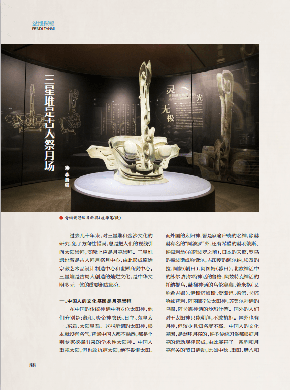 过去几十年来,对三星堆和金沙文化的研究,犯了方向性错误,总是把人们的视线引向太阳崇拜,实际上应是月亮崇拜。三星堆遗址曾是古人拜月祭月中心,由此形成原始宗教艺术品设计制造中心和世界商贸中心。三星堆是古蜀人创造的灿烂文化,是中华文明多元一体的重要组成部分。