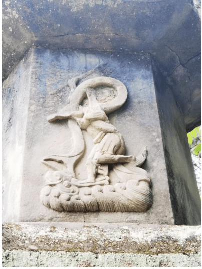 面向龙凤桥的三层塔壁上雕刻一幅方形石龛,凸刻一尊神祇坐像。石龛顶部垂立帷幔,神像头戴冠冕,两条飘带从耳后垂至胸前,双手环托腰间朝带,袍裾飘洒。整个神祇坐像端庄,气势威严,应是镇守河流、庇护桥梁和字库塔的保护神。其余石壁皆雕刻有牡丹、忍冬、莲花等花叶图案,刻画清晰,线条繁复,非常精美。