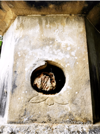 字库塔南向正面的第二级,石体中空,系人力凿空所为,用于投送字纸焚烧。正中间为直径二十厘米的圆形石孔,顶部刻制回旋形仙桃桃尖,下部凸雕两片桃叶和叶托,叶脉清晰,叶柄粗壮,远观整个带叶仙桃的形象栩栩如生。
