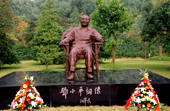 邓小平铜像矗立协兴镇牌坊村邓小平故居附近,三面环山,树木环抱。