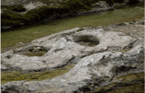 筲箕槽这段河底较平坦,不知古人何时在这里架过桥,桥长约10米。右岸边河底上凿有8个圆孔,每个孔孔口有碗口大,深约尺余,每4个一组,排成斗形,孔间距约80㎝,后与木工师傅交谈,方知柱间应是用1米左右长的横梁连接,俗称羊圈,圈内填充卵石,成为桥墩,对面亦如是6个圆孔,桥略斜向,跨度约6米。桥墩上放6米长的圆木数根,再于圆木上铺上厚木板,立上扶手,再搭上引桥,桥即建成,当然亦是一项不小的工程。