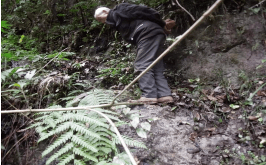 遥想当年,多少背夫客背着背夹子,负重百多斤,提着拐子,三步一歇,五步一拐,汗水长淌,嘘风打哨(背夫打拐歇息时撮圆嘴唇,长长地嘘口气,发出悠长的哨音),行走在绝壁上,那是何等的艰辛!但是川西平原上多少货物沿着这条小道源源不断地流进涉藏州县,流向远方,把巴蜀文明从茶马古道上传向欧亚大地。