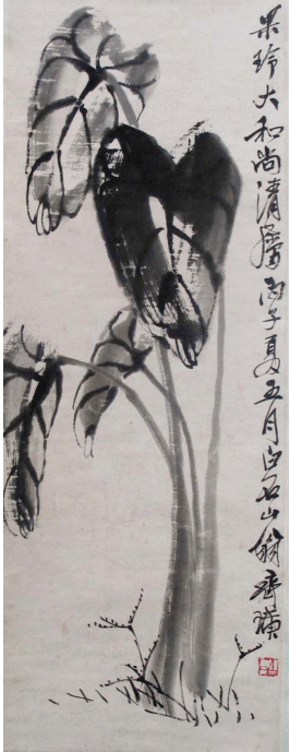 齐白石到了报国寺,果玲和尚自然热情接待,谈到高兴处,齐白石写《墨芋图》一帧赠与果玲和尚,此帧为纸本,纵94.5厘米,横335厘米,画面右边题款:“果玲大和尚清属,丙子夏五月,白石山翁,齐璜。”钤朱文“白石”印,1997年四川科技出版社出版的《峨眉山志》载:“此轴1936年写于峨眉山报国寺待月山房。”