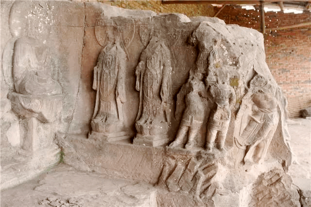 实际上大旺寺石刻毁坏严重,好些佛像没有了头颅。没有了头颅的佛像仿佛没有了灵魂,看上去怪怪的。但你仔细前去观看,灰色片岩上的雕刻,那衣物的皱褶,那莲花的花瓣,那璎珞的珠串,那手脚的细微处,都是那么栩栩如生,都是那么有生命力的律动。佛像造型端庄,形态大方,正襟危坐;人物雕刻线条细腻,飘逸且有动感。服装华丽,代表当年人们的流行穿戴与服饰文化。好几尊石刻人物组群,都是男左女右,没有了头颅,男的峨冠袍服,女的裙装秀美,饰物华美。还有一人物浮雕,造型完整,手持莲花灯,身体微微前倾,是要赶路去约会?还是回家与亲人团聚?步态匆匆,情意切切,好有戏剧化情节感觉。有一舞者,左手上举,似招摇状,右手叉腰,臀部顺着左边略微倾斜,是最曼妙的舞姿;腰部的曲线灵动,手的姿态秀美,裙摆摇曳,风姿绰约。一尊只剩下半个身子不足二十厘米的小石像,女士身上穿的裙子可以辨认是彩色的,是唐三彩么?当然不是。
