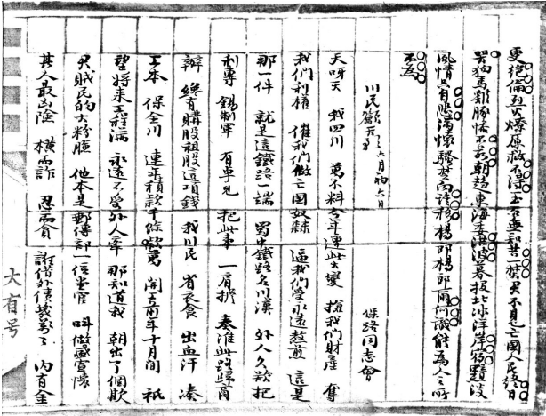 1911年10月7日(宣统三年八月十六日),陈光前先生在《迪山日记》中全文摘录了1911年7月1日(宣统三年六月初六日)《四川保路同志会报告》中的《川民吁天歌》: