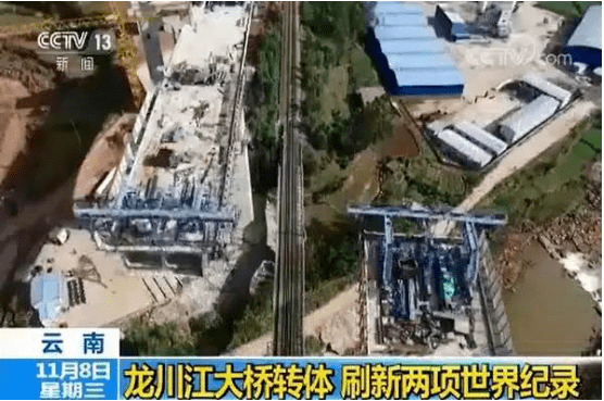 成昆复线龙川江大桥跨越老成昆线,施工单位将桥体分为两段,分别平行建在老线两侧,建好后再进行空中转体,创造了41.4米的大桥墩中转体高度和单体重量7350吨转体两项世界纪录。