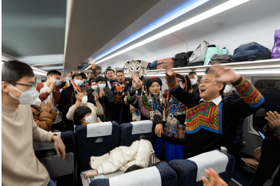 2022年12月26日,彝族群众身着节日的盛装在新成昆铁路首发列车上为乘客表演节目(新华社记者 江宏景 摄)