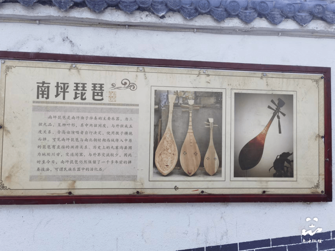 南坪琵琶是南坪曲子伴奏的主要乐器,为三弦九品,使用拨子横抱而弹。可见南坪琵琶与南北朝时期西域传入中原的琵琶有直接的渊源关系。历史上的九寨沟县因地处川边,交通闭塞,与外界交流较少,因此时至今日,南坪琵琶仍保留了一千多年前的弹奏技法,可谓民族乐器中的活化石。永乐镇清平是南坪琵琶曲子的重要发源地。清平巷是九寨沟县本土弹唱艺术家白凤云的出生地,可谓“曲子祖庭、琵琶之根”。