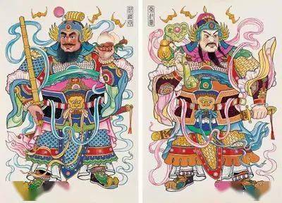 到了宋代,人们又开始在桃木板上写字,也成了对联最初的雏形。民间传说中,也有以关羽和张飞或秦琼和尉迟恭为门神的原型,得到大众认可、接受。而门神画则是年画的起源,门神画起初叫“门画”,古代《荆楚岁记》《东京梦华录》《武林旧事》等都有记载。