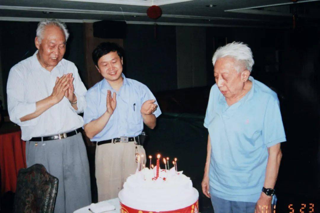 2001年5月,四川省地方志编纂委员会贺何郝炬先生(右)80寿辰(左为岳忠先生)