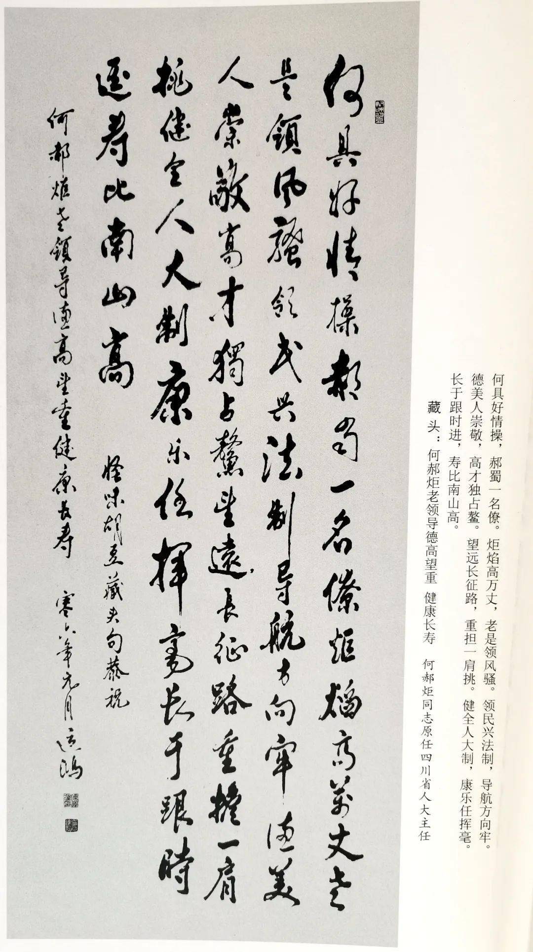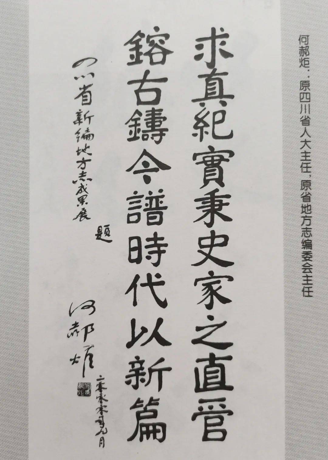 2000年9月,何郝炬先生为四川省新编地方志成果展题写“求真纪实秉史家之直管,镕古铸今谱时代以新篇”对联