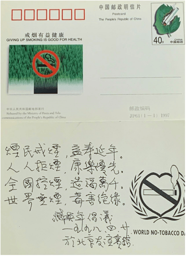 1997年9月,第十届世界烟草或健康大会在北京召开。笔者联合卫生界人物建议邮电部发行控烟邮票,推广控烟信息。邮电部发行了戒烟明信片,正面回应。