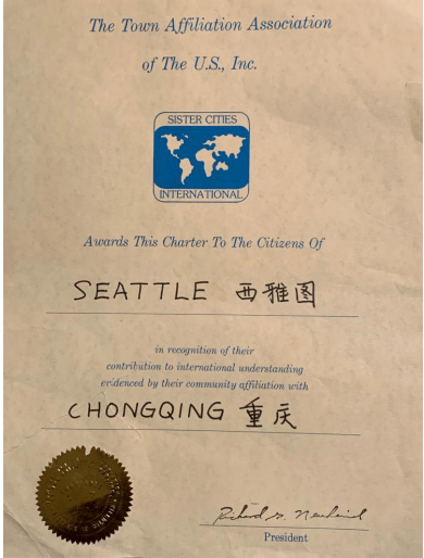 国际友好城市协会主席颁发给西雅图、重庆的友好城市证书