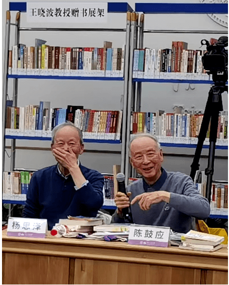 2023年3月24日,王晓波教授纪念座谈会在清华大学图书馆会议厅举行。图为王晓波的保钓同志陈鼓应先生当场开心赠书