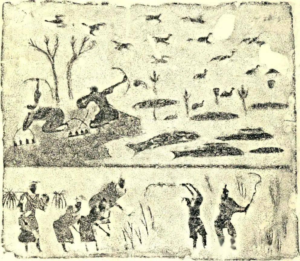 20世纪80年代,新津安西镇出土了大量宝墩文化时期的石斧、石锛、陶片和狩猎用的石弹丸、石簇等,还有大量兽骨、兽牙、鹿角和兽骨磨成的骨钩。在安西镇顺南河边,还发现了大量的橄榄状红陶网坠(渔网用)。1989年,文管部门在安西镇(原铁溪乡中合村)砖厂收集到一方东汉“弋射·收获”画像砖。画像的上半部是渔猎场景,水池中,荷花垂露、大鱼浮游,空中群鸟疾飞。树荫下,有两人正张弓猎射空中飞鸟;画像的下半部则清晰地展示了两名农夫挥动“铁钹镰”收割稻谷的劳动场景,后有三人做捆扎状,最后站立一人,肩挑禾担,手提一食具,正欲离去。