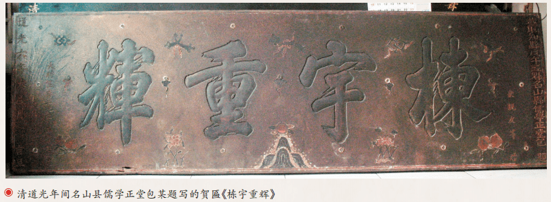 《栋宇重辉》匾额制作于清道光六年(1826),距今195年。上款为“截取知县戊午经魁名山县儒学正堂包题 众亲友等赠”;下款为“大时望李二先生玉香荣建 道光六年大吕月吉旦”;匾文为“栋宇重辉”。是随时可能由吏部选任为知县、清嘉庆三年(1798)科举五经考试第一名、时任名山县(今雅安市名山区)儒学正堂的包某题写,名山县某地众亲友赠送给很有威信和声望的李玉香先生的贺匾。众亲友盛赞李先生修建的房屋高大雄伟、光彩熠熠。李先生的自豪之情、众亲友的由衷羡慕和喜悦之意均充溢其中。同是这位名山县的“教育局长”,还在清道光十一年(1831)为名山县“大财望”刘国英的新房落成题写过匾额《云蒸霞蔚》。