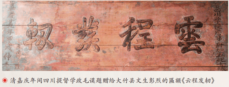 《云程发轫》匾额制作于清嘉庆十九年(1814)农历十一月,距今207年。上款为“钦命提督四川学院詹事府加五级十次毛为”;下款为“文生彭烈立大清嘉庆十九年甲戌仲冬吉日”;匾文为“云程发轫”。由时任四川提督学政、詹事府“下派”而来、多次因政绩显著获嘉奖晋级的毛谟,为文生彭烈所立。前路青云万里,此刻启车行进,毛谟祝彭烈前程远大。同年同月,毛谟还与署四川绥定府(今达州市)大竹县正堂的朱某联名,题写过另一块匾额《科还汉室》,也是赠给这位文生彭烈。由朝廷委派到四川主持教育考试、督察各地教育的高官,一再为一位生员题字,一方面是看好这位生员,另一方面也是对自己治下的教育有立标、引导、督促的用意。至于由大竹县秀才起步的彭烈,其受到的鼓舞、得到的动力可想而知。从匾额简朴的形制看,更能感受到彭烈身后那个贫寒家庭的亲人们对后生奋发上进的欣喜、鹏程万里的期待。