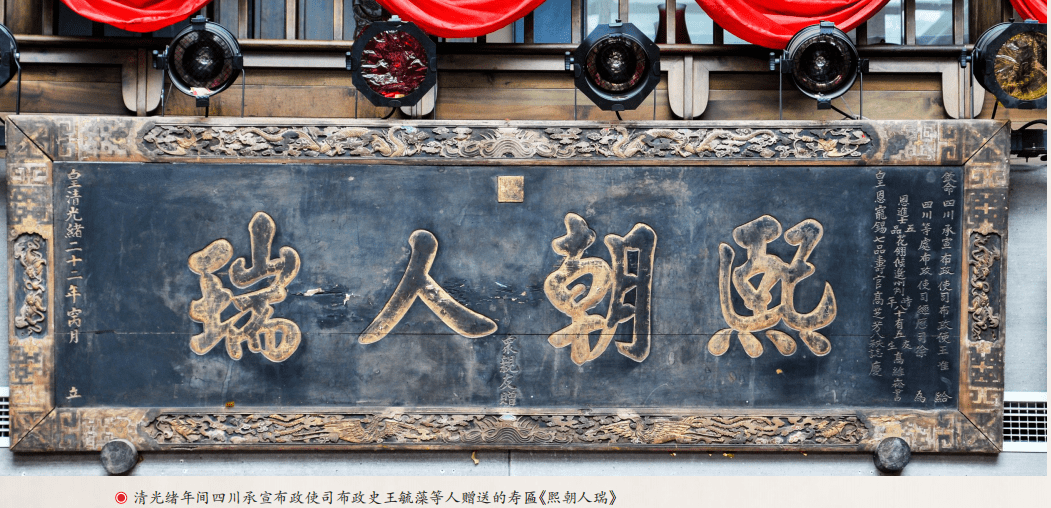 《熙朝人瑞》匾额制作于清光绪二十二年(1896)农历三月,距今125年。上款为“钦命四川承宣布政使司布政史王准给四川等处布政使司经历司徐为恩进士五品花翎候选州判时年八十有五友生高维崧书皇恩宠赐七品寿官高芝芳八秩志庆”;下款为“皇清光绪二十二年窉月立”;匾文为“熙朝人瑞”。是时任四川布政使司布政史王毓藻准予,四川布政使司经历司经历官徐某具体操办,在国子监读过书的五品官员、85岁的高维崧以师长身份书写,赠送给七品官员高芝芳的80岁寿匾。匾文“熙朝人瑞”4字出自明末崇祯皇帝赠送给回乡伺候百岁老父的原礼部右侍郎黄士俊的匾文,意为“兴旺朝廷的百岁老人”;后世此句多用于敬老重老或表彰长寿者。该匾额最博眼球的是其中4个人物的身份及形制。王毓藻主管全省财政、民政等,是“副省级”;布政使司经历官徐某为“副厅级”;书写者高维崧虽未任过实职,但也享受“正厅级”待遇;寿星高芝芳则为“县处级”。匾额形制庄重,加有边框,边框上沿雕二云龙、下沿雕二飞凤、左右沿对称雕二麒麟,正文上方嵌正方形官印一枚,文字及边框皆描金,实在难得。