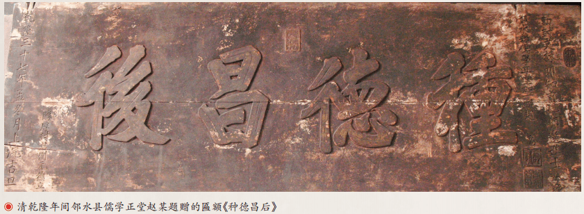 《种德昌后》匾额制作于清乾隆三十七年(1772)农历十月,距今249年。上款为“敕封文林郎知前乙卯选进士今授邻水县儒学正堂加一级赵为”;下款为“醇厚封君刘元德立 乾隆三十七年孟冬月上浣吉旦”;匾文为“种德昌后”。由七品文官、时任邻水县儒学正堂、参与过清雍正十三年(1735)选拔进士的殿试、获得过一级嘉奖的赵某,为刘元德所立。古人有“种树者必培其根,种德者必养其心”的说法。从匾文看出,这位叫刘元德的先生纯朴、忠厚、善良,很注重个人心性的培养,品行端庄、道德高尚,让后人和后世得益,并因此受到封赏、享受一定级别官员待遇。