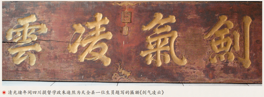 引人向善、催人上进的匾额,还能见到清道光七年(1827)四川直隶茂州(今北川、汶川及茂县等地)儒学正堂、候选县正堂聶某,夸赞本州庠生罗发龙文章写得好所立的匾额《龙章凤藻》;清光绪四年(1878)四川雅州府天全州(今雅安市天全县)儒学正堂李某,题写给一位道德品行好、威望高的老者的匾额《星焕银河》;清光绪七年(1881)四川提督学政朱逌然,为天全县一位“大德望”李老先生的儿子考入府学、成为生员题写的匾额《剑气凌云》等。德行善举是唯一不败的投资,勤勉上进是任何时代成功的要诀;匾额很古老,讲述的却是新鲜、永不陈旧的话题。