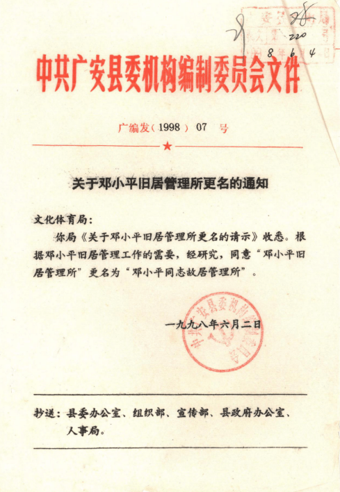 1998年,经广安县委编委批复,邓小平旧居更名为邓小平故居。