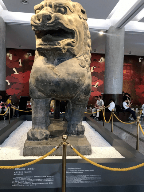 挂上接收器戴上耳机,参观就正式开始了,大厅正中央立着一尊高大雄壮的石走狮,这是武则天之母杨氏咸阳顺陵陵园的石刻,其高大雄伟、气势磅礴的形象,表现出盛唐雄壮豪迈的时代风格,是中国历代石狮中体量最大的一尊,被誉为“东方第一狮”。不过这尊石走狮却是个复制品,真的不知道在哪里。