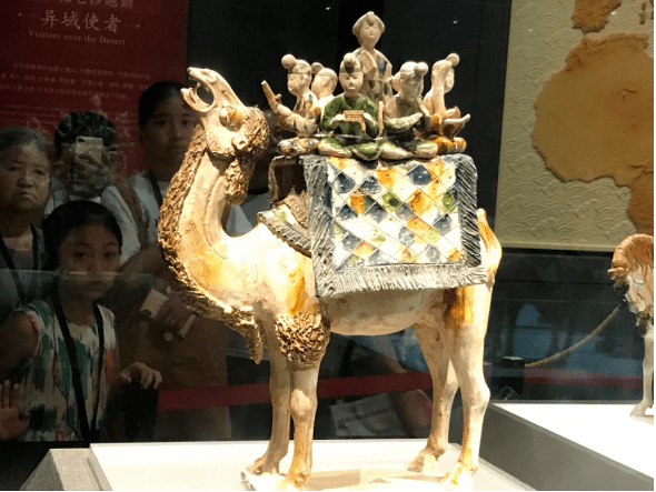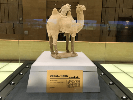 参观接近尾声,国宝厅里的陕西国宝系列特展展出了一件唐代骑驼胡人小憩俑。该国宝长60厘米、高73厘米,1987年西安市韩森寨红旗电机厂出土,现为西安博物院藏。骆驼体形高大,背有双峰,曲颈昂首站立。背上一胡俑,侧身盘腿横骑驼背,左手扳着左腿,右手搭于驼前峰,枕臂小憩入梦。栩栩如生的造型,将骑驼胡俑在漫漫丝路上因长途跋涉而疲惫不堪、途中在驼背上暂作休息的情形,刻画得惟妙惟肖,极具时代感和生活气息。