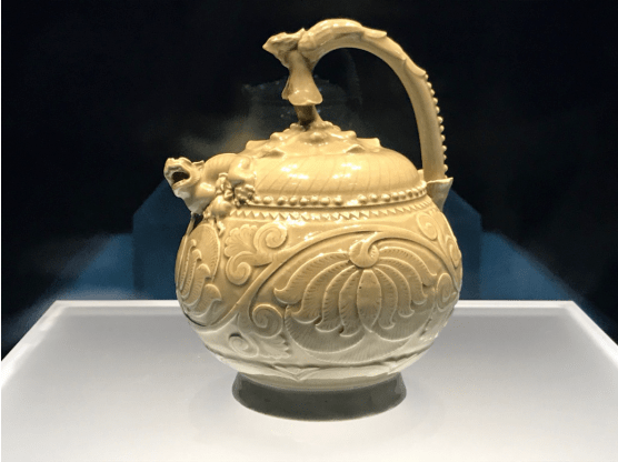 第三展馆主要展出了具有隋唐时代典型遗存及唐以后时期的文化风貌代表性的珍贵历史文物。这里面有3件国宝,分别是:三彩载乐驼、青釉提梁倒注提壶、黑釉油滴碗。