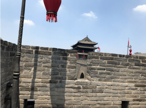 我们从南门永宁门上的城墙,城墙上挂满灯笼、旌旗招展,可乘坐观光车,也可骑自行车。即将出城门时,笔者靠在城门下通道边盘坐地上,静静地看着城墙,触摸斑驳的石壁,感受历史的厚重与沧桑。