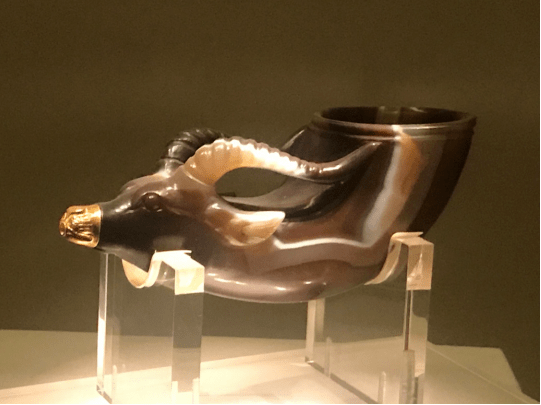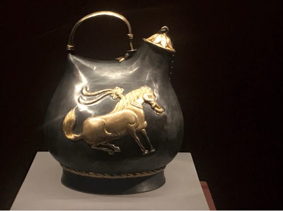 看完这3个常规展馆,就是收费展馆了,收费展馆有两个:何家村大唐遗宝展、唐代壁画珍品馆。1970年10月5日,陕西西安南郊何家村的一个基建工地上,施工的工人挖出了一个高65厘米、腹径60厘米的陶瓮,里面装有大量金银器。1970年10月11日,在第一个陶瓮出土地点的北侧不远处,考古人员又发现了一个大小类似的陶瓮,瓮上面盖有一层银渣,其内装有金银器和玉器。考古人员在陶瓮的旁边,还发现了一件高30厘米、腹径25厘米的银罐,银罐内装有一件精美的镶金兽首玛瑙杯(国之重宝)。这次出土的文物被称为何家村唐代窖藏。