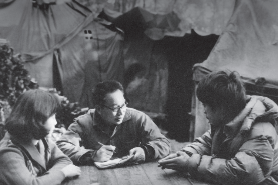 一天的野外考察结束后,胡锦矗教授与学生们一起整理笔记