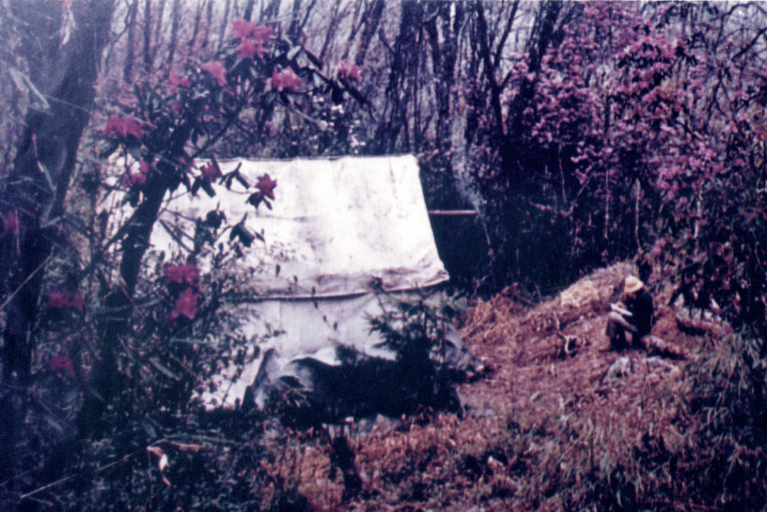 我们终于到达预定的位置——海拔2520米的白岩,观察站就准备建在这里。我们砍树,除草,刚刚整理出了一小块地方,老天就变了脸。大雨哗哗地泼下来,淋得我们浑身透湿。初春的雨,带着刺骨的寒气,冷得我们牙齿打颤。我们把篷布拉平,一个人顶着一只角,中间用树枝支起,再抽出人来,在中间点火架锅,烧水煮饭。我们摸黑架起了帐篷。大半天后,终于风停雨住。