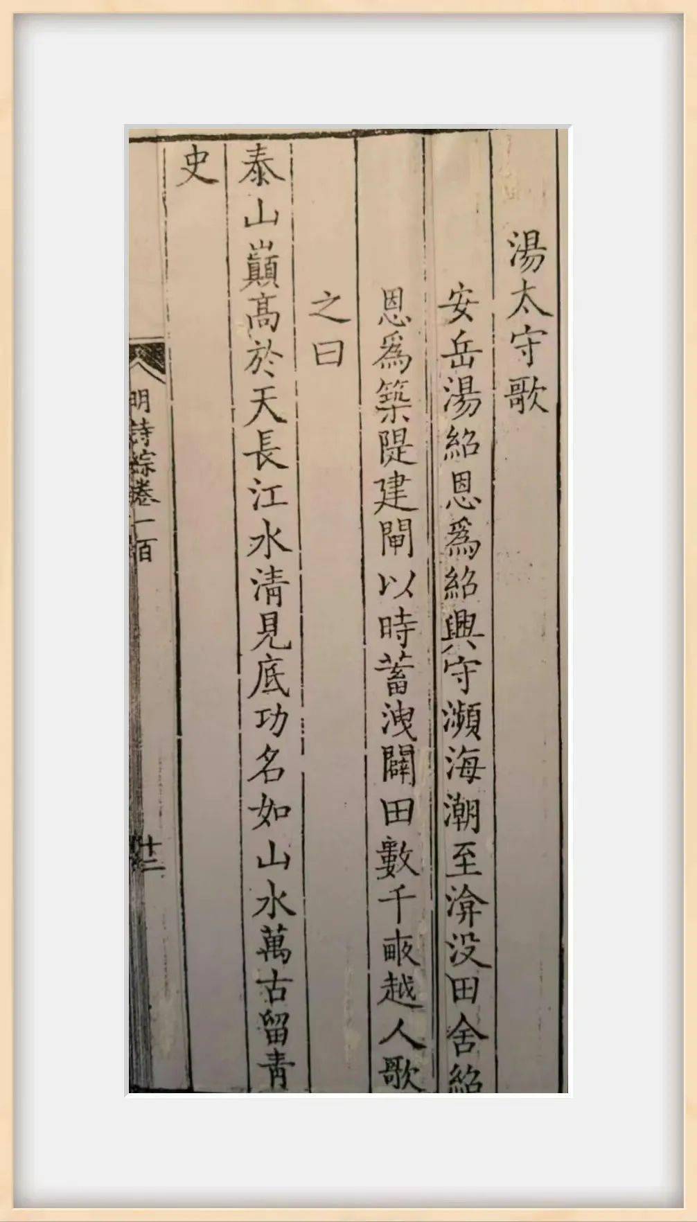 《汤太守歌》又名《颂汤侯德政歌》:泰山巅,高于天;长江水,清见底。功名如山水,万古留青史(载朱彝尊所编《明诗综》)