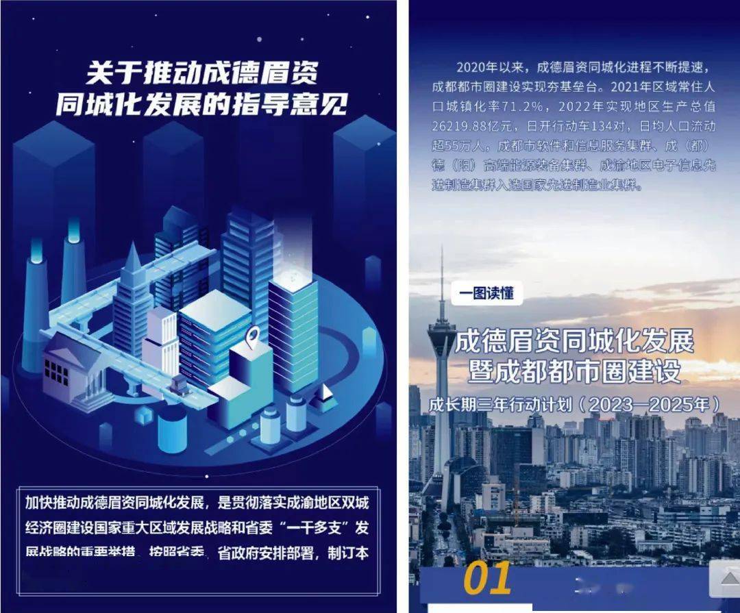 左图:2020年7月,四川省委办公厅、四川省人民政府办公厅《关于推动成德眉资同城化发展的指导意见》。右图:成德眉资同城化发展暨成都都市圈建设成长期三年行动计划(2023—2025年)