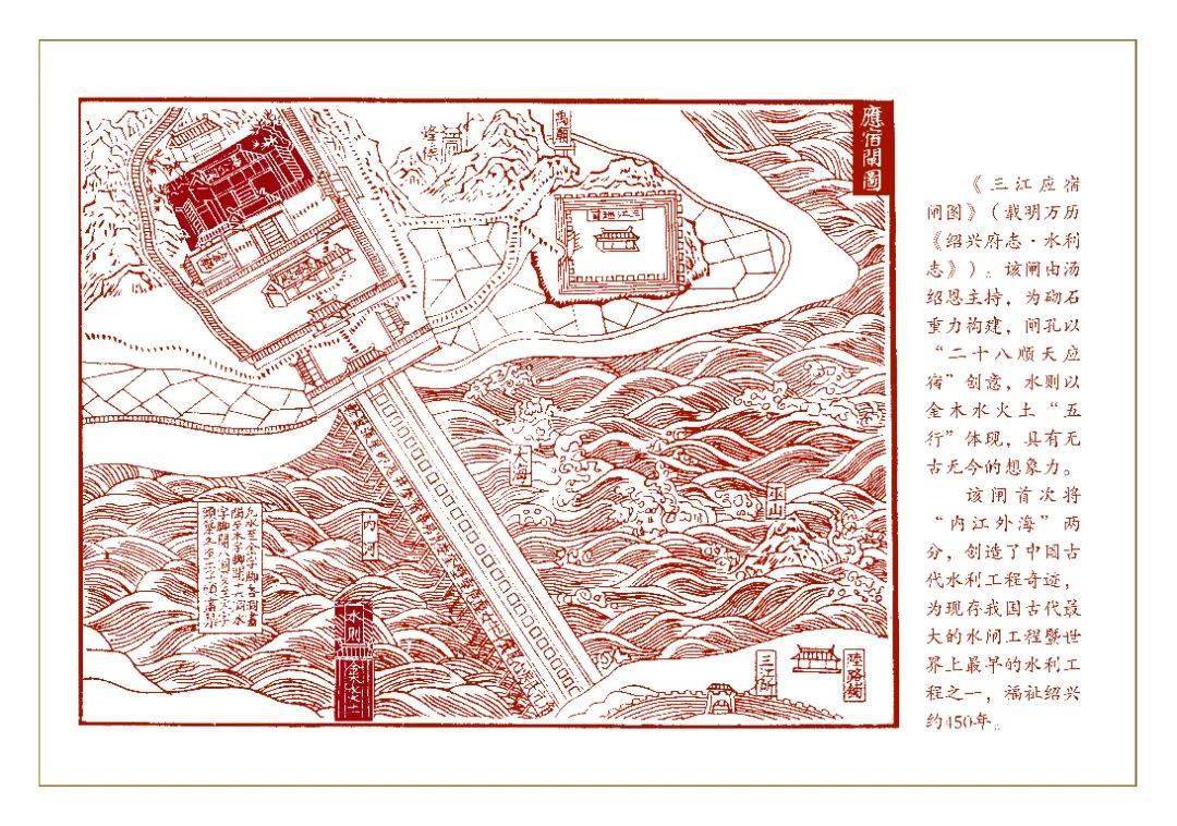 《三江闸图》载明万历《绍兴府志》。汤绍恩主持修建的三江闸,首次把江海两分,创造了中国古代水利工程奇迹