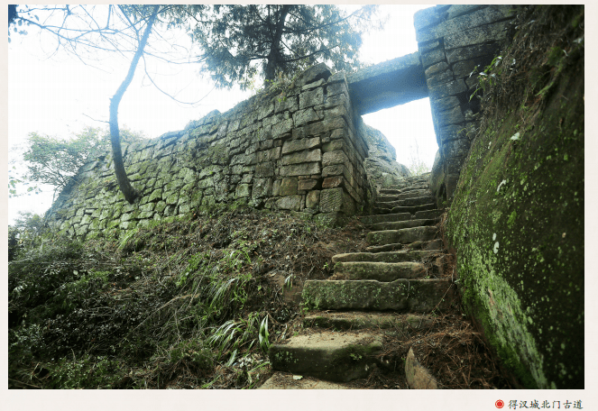 城墙今天,在得汉城西门一带发现有较多城墙残留。城墙建在崖壁顶端,断续残长约100 余米,最高处约3 米;墙内为道路,因此该城墙主要是防止人员跌落悬崖,起着栏杆的作用。因得汉山四周几乎都是数十米高的悬崖,仅在北门、东门和西门等地有径可通,故在这些地方筑有一些城墙。