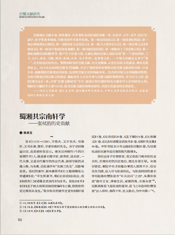 【文史英华】蜀湘共宗南轩学——张栻的历史贡献‖杨世文