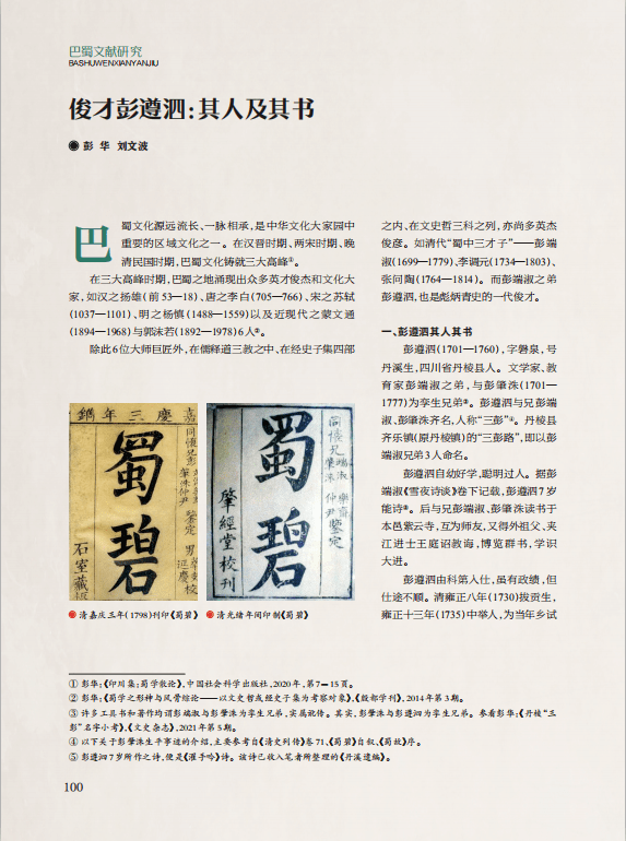 据民国12年(1923)版《丹棱县志》记载,彭遵泗“又纂《蜀苑》,未成,卒”。渝江王家驹《丹溪遗编·跋》说:“今遇公嗣君延庆于京师,得读公遗集并所纂《蜀苑》,循环把玩,慨然增叹……惜《蜀苑》为公未成之书,尚须校订。”《蜀苑》存世与否,尚需查核。