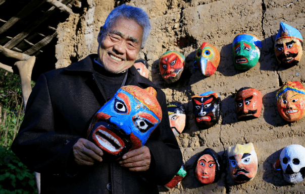 双峰乡傩戏艺人,破旧立新,将和好的泥捏塑成不同形象的傩戏面具,一字排开,摆放到院坝晒。等到面具干透心一半,手拿时不掉泥,不断折的程度为宜,就用画笔,描绘上色。一张脸壳面具,从和泥、捏塑、翻晒、搬动、上色描绘,到成为一张真正的艺术品,常常会花费三五日,或许更久。艺人把每一张傩戏面具,当作是自己的孩子来精心呵护。制作好了也是自己最先戴上,看看哪些地方需要修改。艺人琢磨着某张傩戏面具常常达到废寝忘食的程度,代表着艺人的独具匠心与艺术灵魂。