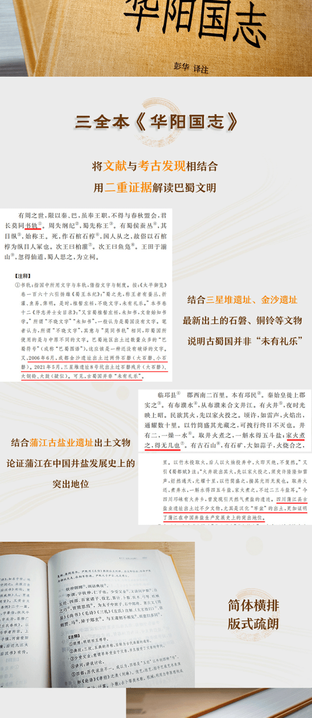 考证史实。《华阳国志·序志》:“又言蜀椎髻左衽,未知书,文翁始知书学。”译注者认为,巴蜀并非“不晓文字”,而是该地所使用的是与中原不同的文字。巴蜀地区出土过数量众多的“巴蜀符号”(或称“巴蜀图语”),这应该是一种还没有被破译的文字。2006年6月,成都金沙遗址出土过两件石磬(大石磬、小石磬);2021年5月,三星堆遗址8号坑出土过石磬残片(大石磬)、大铜铃、大鼓(疑似),这也证明古蜀国并非“未有礼乐”。