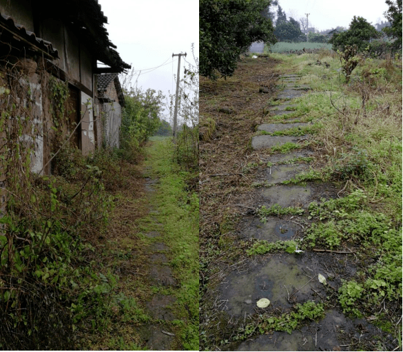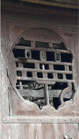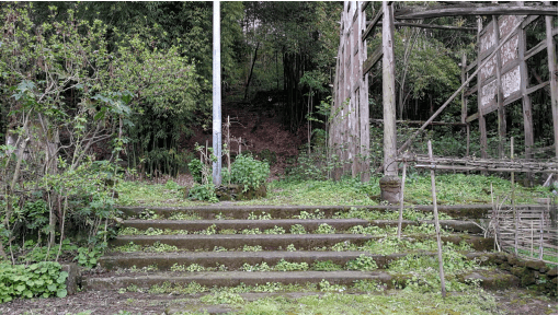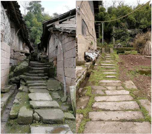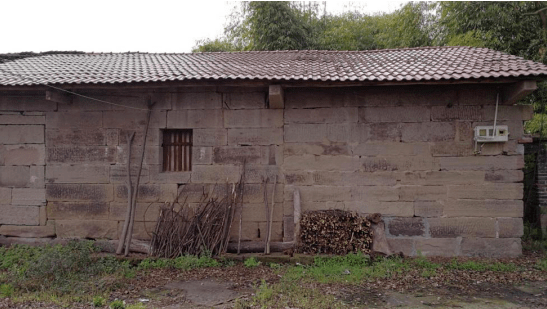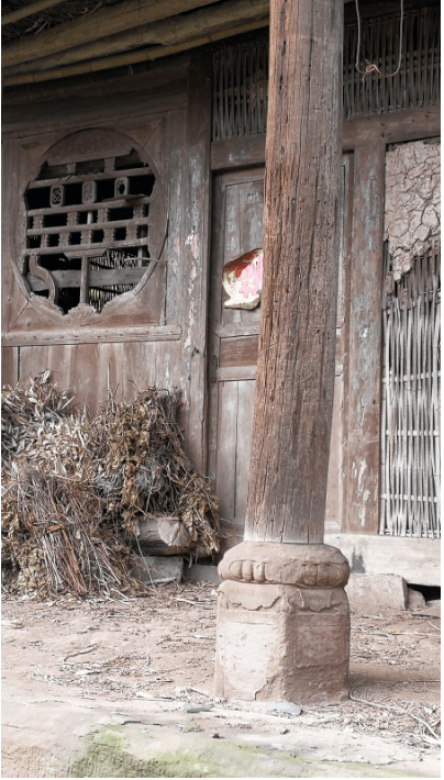 天佑寨下面有一个典型的川东北民居院落,大部分是石木结构的房子,通往各家的是一条条石板路,显得古朴沧桑。院落里有一个已破败的三合院,占地约1000平方米,从残存的轮廓看,非常大气、高雅,房子柱子下面的石墩以及窗户雕刻非常精美,以前应是一大户人家的住宅。正中间的房子后来被改成一所学校,现已荒弃,已不再有琅琅读书声。
