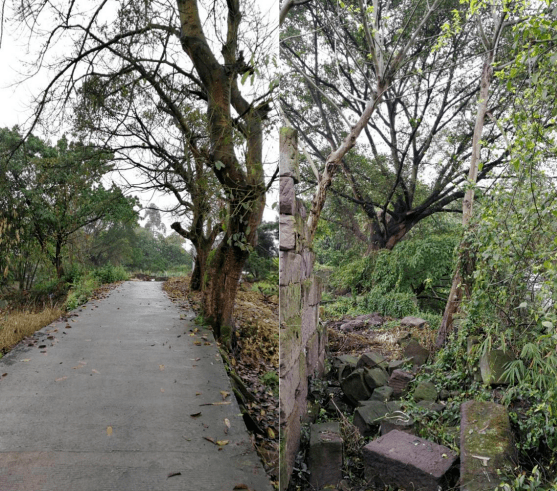 寨内有一条宽约2米、长约500米的古道,这是原寨内的街道;两边是一些断壁残垣,是以前寨子里面的店铺,这些残破的房子还能见到清代民居的遗风。