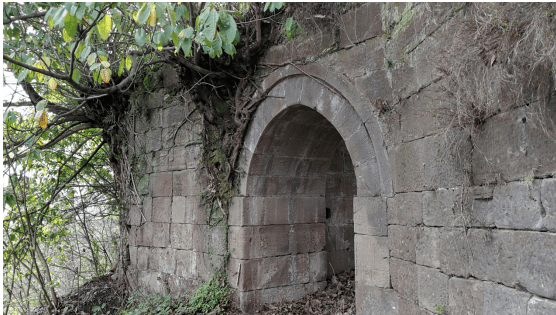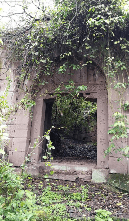 寨门已坍塌一个,另一个比较完好。完好的寨门拱门上面刻有“大清咸丰四年甲寅□造修天佑寨众□议”字样。
