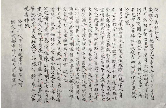 四川省司马相如研究会会长、四川师范大学文学院教授李大明先生为司马相如诞辰2202周年撰写的《祭司马相如文》(蓬安县司马相如研究会理事 杨宏文 敬书)