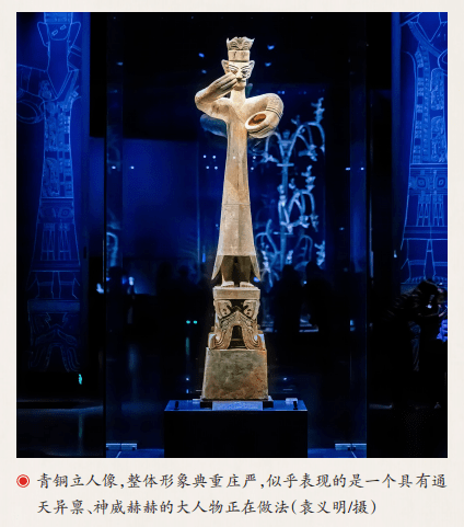 流光溢彩、充满异域风情的金权杖,极度夸张的青铜纵目面具,造型瑰丽的青铜神树,伟岸、神秘肃穆的青铜大立人像,彰显着古蜀国的赫赫神威与至高无上的王权、神权……