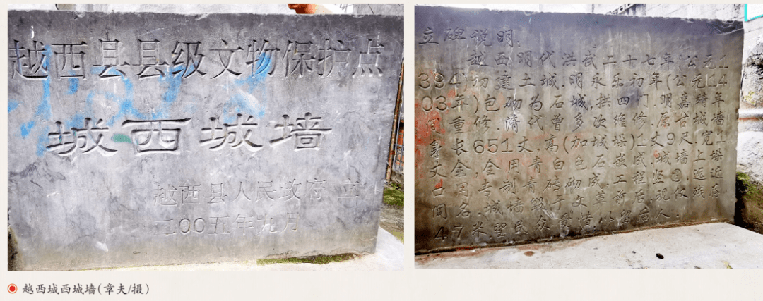 看我兴致甚高,余寒先生告诉我,越西县还残留有一段明清时的城墙,不过已很难找了。我一下子来了兴趣,兴奋地拉上他,在繁华的越西老街上寻觅。我们穿梭在一条又一条小巷里,避过人流与车流,询问当地街坊老人,终于在城西边一条名叫城隍庙的小巷里,找到那段仅存几米的老城墙。城墙已成为一幢高楼的地基,如果不是刻意寻找,很难发现这一十分珍贵的历史遗存。