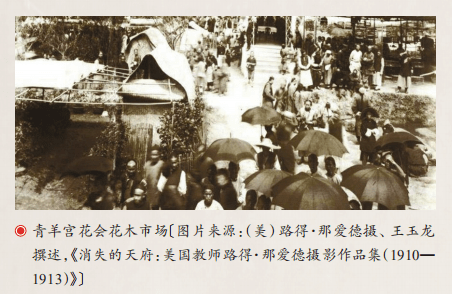 清末官方为奖进实业,在花会的基础上将之改造为劝业会,开四川博览会的先河。青羊宫、二仙庵两庙在清末新政时虽是官方、精英改造的对象,但其形象仍是清代成都最为繁华的集会之地,到民国则骤然降低到了“腐朽庙舍”。由于军阀战乱,劝业会时断时续,不过民间的花会仍相沿无辍,四乡的人来此赶青羊宫仍然如故。据李劼人描写赶青羊宫花会的情形可见花会之盛如故: