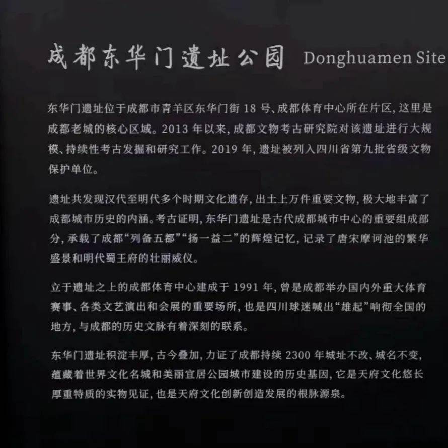 “九天开出一成都,万户千门入画图。”唐代诗人李白《上皇西巡南京歌十首》一诗道出成都厚重的历史与历史的辉煌。历史文化是城市的灵魂。东华门遗址蕴含的丰厚历史,不仅力证了成都持续2300余年城址不改、城名不变的城市格局,同时也印证了成都城市发展的轨迹与脉络。唐代诗人王勃《入蜀纪行诗序》誉成都为“宇宙之绝观,优游之天府”。我们相信,东华门遗址公园必将成为成都一张崭新的金色名片,其蕴含的厚重历史也必将勾起一代又一代成都人的历史记忆与浓浓乡愁。